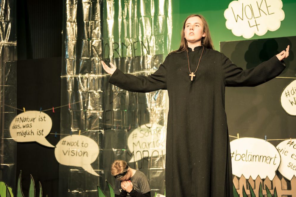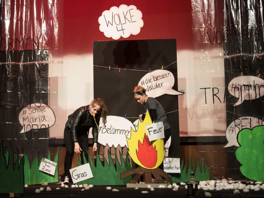 Die komödiantische Parabel „Die besseren Wälder“ von Martin Baltscheit beschreibt Ferdinands Suche nach der eigenen Identität und wirft dabei eine Menge Fragen auf. Was macht mich zu dem Menschen, der ich bin? Gene, Herkunft, Sozialisation, Erziehung oder die kulturelle Prägung? Und welche Rolle spielen Werte und Traditionen? Kann man Freiheit genießen, wenn man hungern muss? Und wie sieht es mit der Moral aus, wenn man nichts zu essen hat? Wie viele Welten/Wälder gibt es eigentlich und ist eine besser als die andere? Die Theater-AG der Marienschule unter Leitung von Cara Basquitt hat sich mit diesen Fragen auseinandergesetzt und eine spannende Inszenierung erarbeitet. Die öffentlichen Aufführungen fanden am Samstag, 13. Juni 2015 um 20:00 Uhr und am Sonntag, 14. Juni 2015 um 18:00 Uhr in der Aula der Marienschule statt, die Aufführung für Schulklassen am Montag, 15. Juni 2015 in der 3./4. Stunde ebenfalls in der Aula der Marienschule.